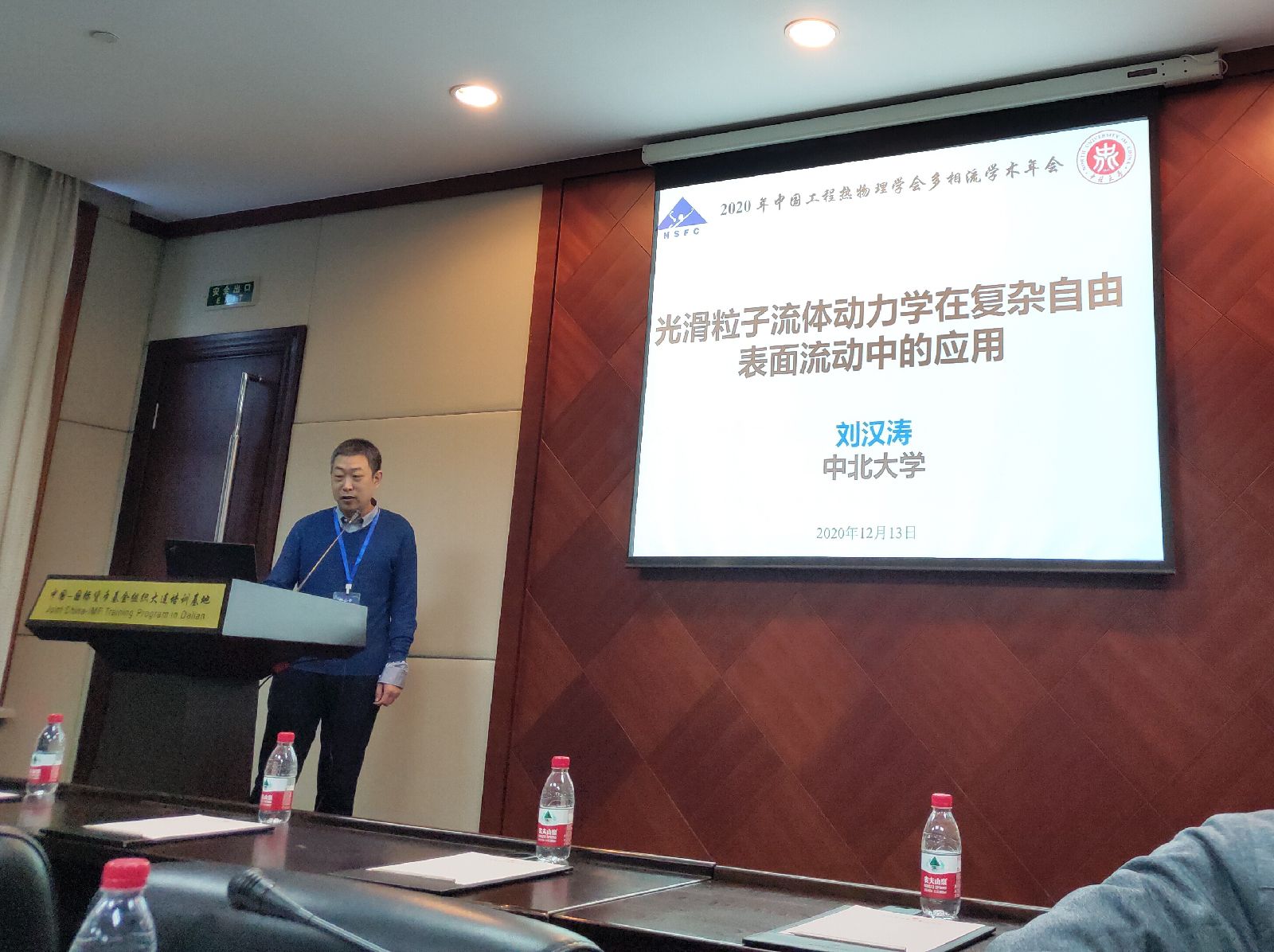 刘汉涛教授受邀以《光滑粒子流体动力学在复杂自由表面流动中的应用》为题作专题报告,李海桥以《基于SPH方法的新型表面张力模型研究》为题作学术进展报告,并与参会专家学者和研究生进行深入交流。