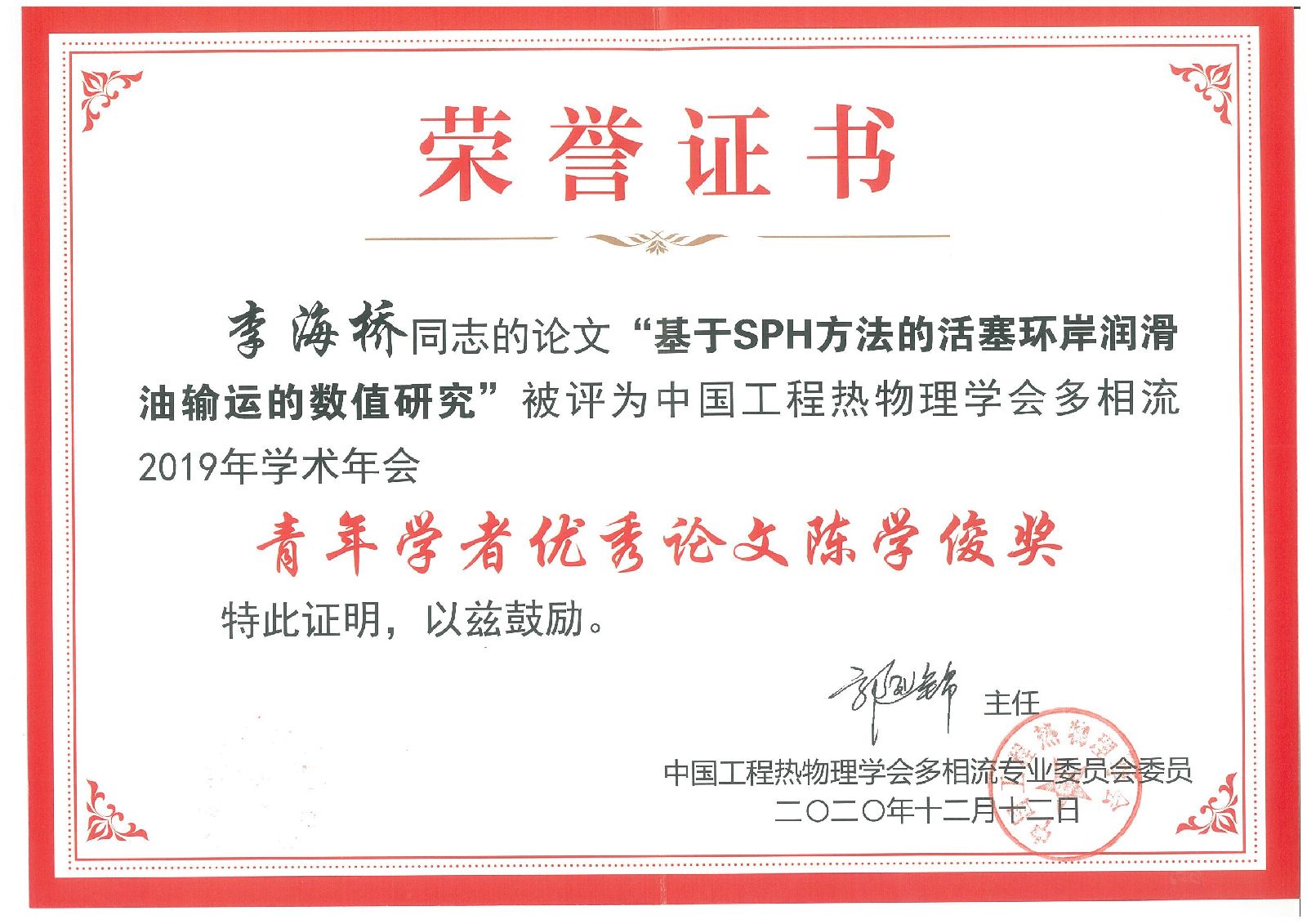12月11日-14日,2020年中国工程热物理学会多相流学术会议暨国家自然科学基金多相流领域项目进展交流会在大连召开。会上,李海桥博士的学术论文《基于SPH方法的活塞环岸润滑油输运的数值研究》获得了中国工程热物理学会多相流2019年学术年会“青年学者优秀论文陈学俊奖”。来自全国各高校、科研院所和相关企业约650余名代表参加了会议。我校能源动力工程学院刘汉涛教授和青年教师李海桥博士参加了会议。